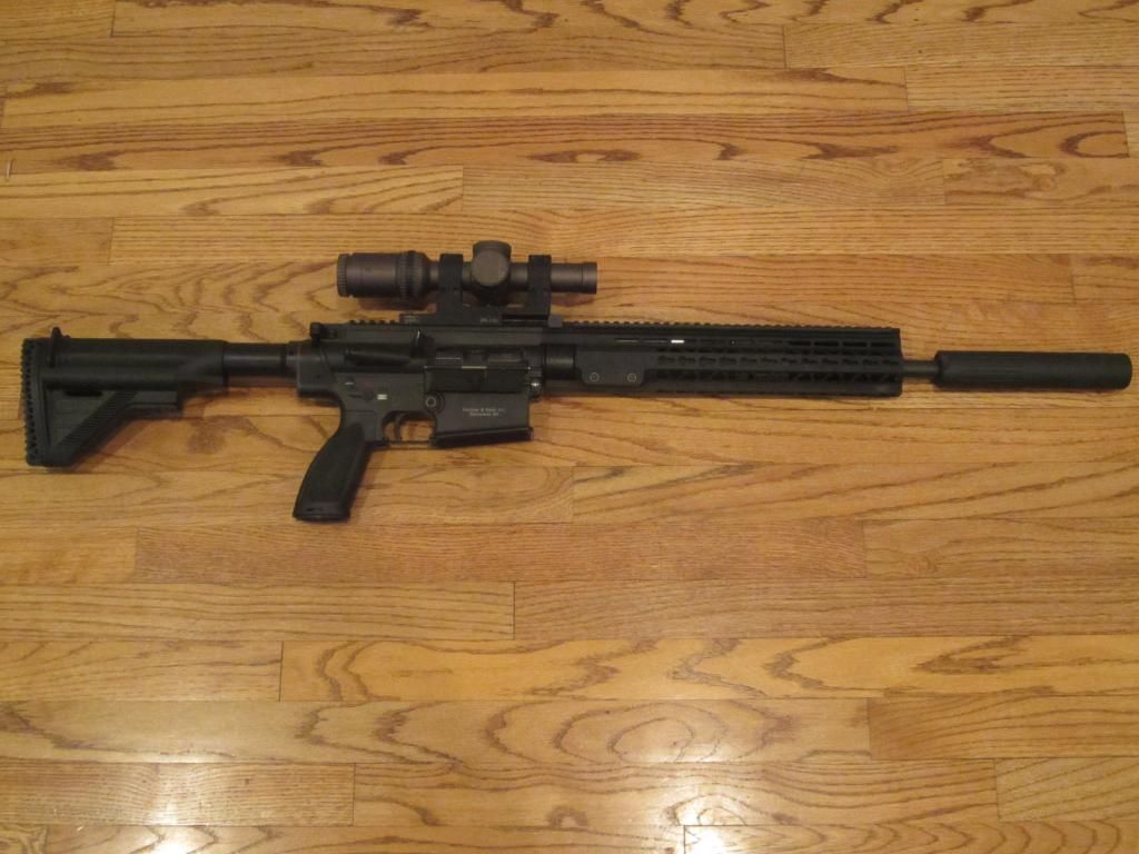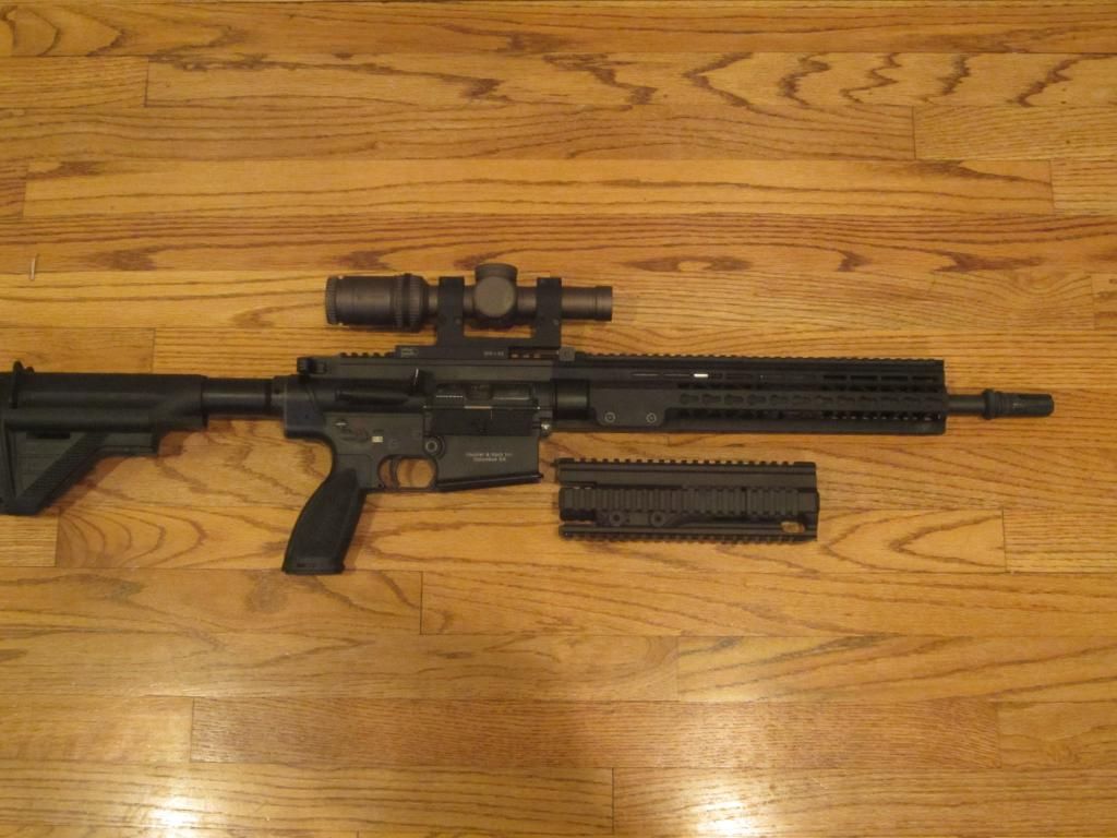 I was fortunate to get my hands on a rail from Val and his team at Sureshot Armament Group. Out of the box the fit and finish are outstanding. It feels considerably narrower than the stock quad rail (even beyond the difference in diameter) and allows for a comfortable solid grip either thumb forward or thumb over bore. It has key mod slots at 3,6,9 o'clock and a picatinny rail the full length of the top rail. It mounts solid to the barrel nut with two recessed mounting bolts. A feature that allows the hand to be drawn all the way back towards the lower receiver without running into the head of a mounting bolt.